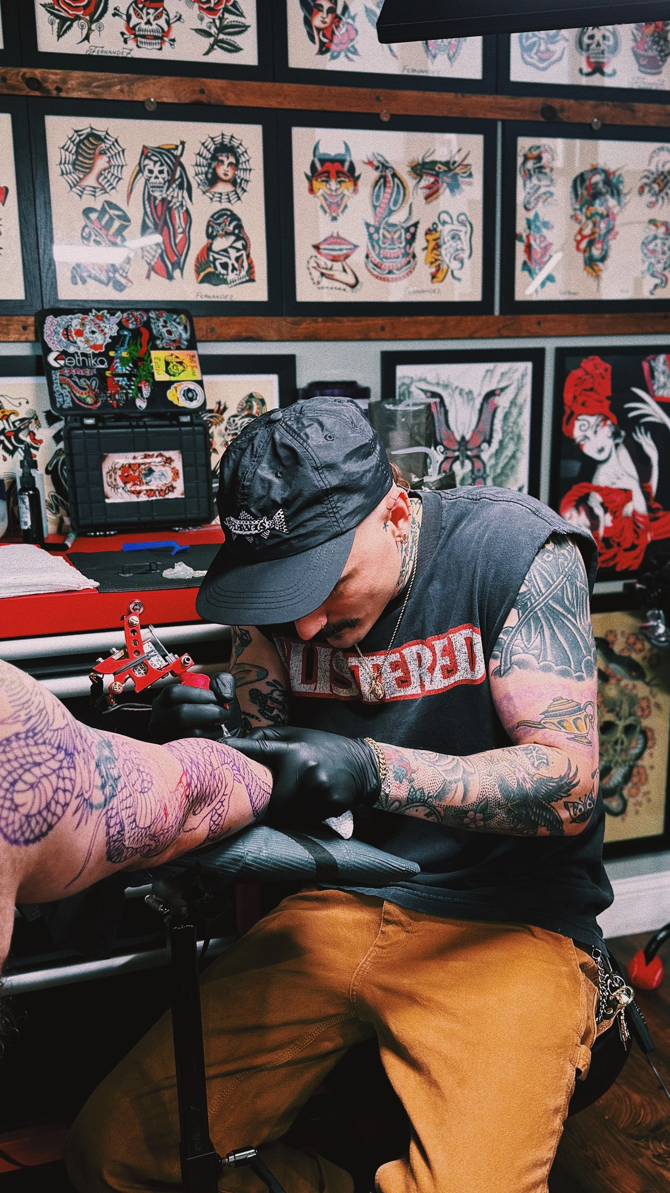 He works in the American traditional style with bold linework, heavy black shading, and vibrant colors. Jake also enjoys to do tribal tattoos, and is versed in many other styles